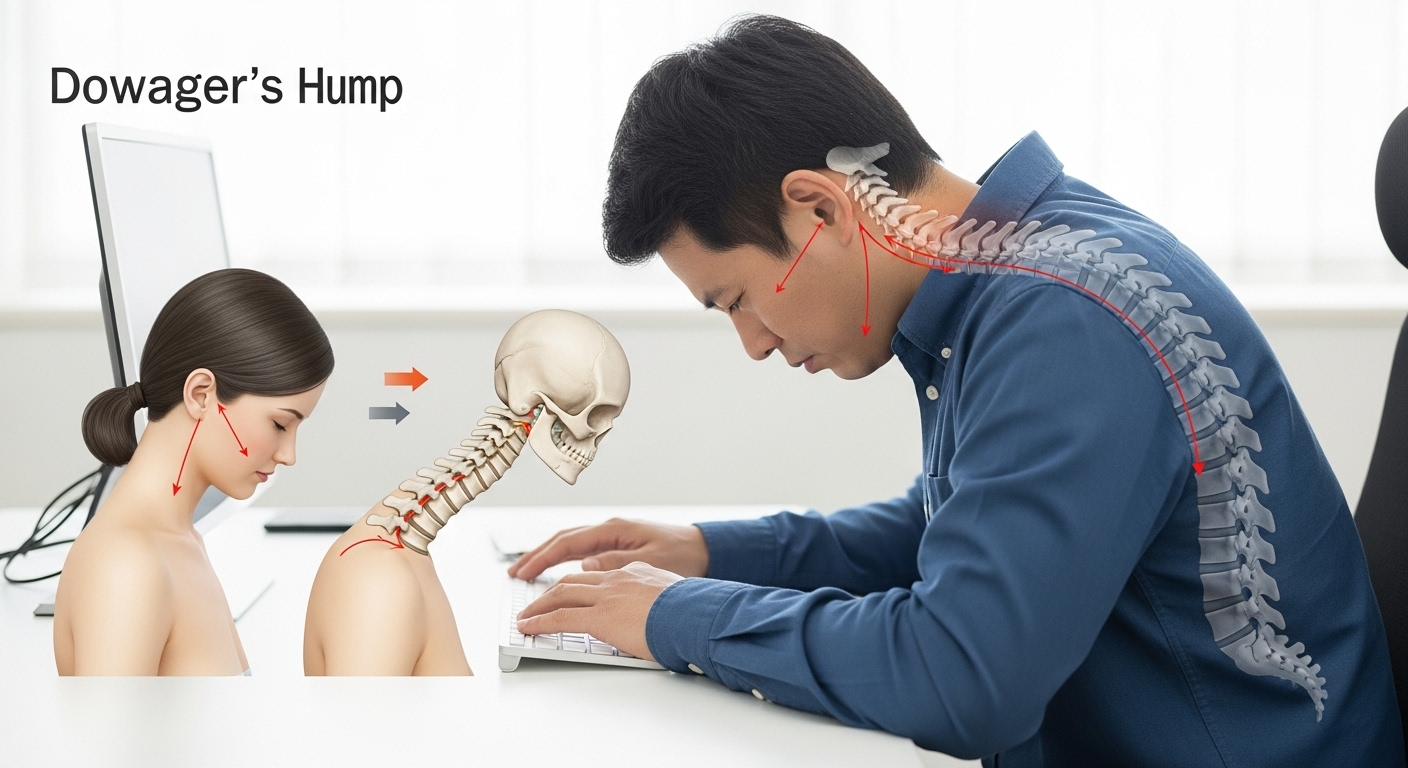 '버섯목 증후군'이라는 이름, 조금 생소하게 들릴 수도 있겠네요. 의학적으로는 '경추후만(Kyphosis)' 또는 'Dowager's Hump', 'Buffalo Hump'라고도 불리는데요. 쉽게 말해, 아래쪽 목뼈(하부 경추)는 앞으로 구부러지고, 등뼈(상부 흉추)는 뒤로 과도하게 굽으면서 목과 등이 만나는 지점(경흉추 이행부)이 불룩하게 튀어나오는 체형 변화를 말합니다.